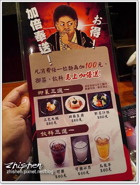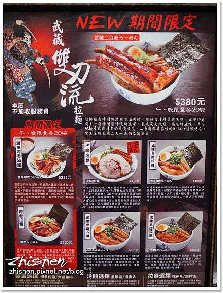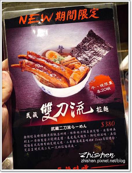 再搭配麵屋武藏特有的炙燒叉燒,二者與深奧美味的W Soup湯頭結合,完全呈現武藏二天一流的拉麵奧義。--以上文字摘錄自MENU