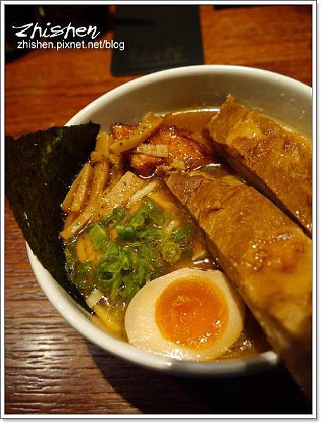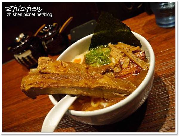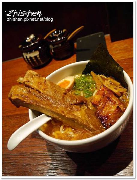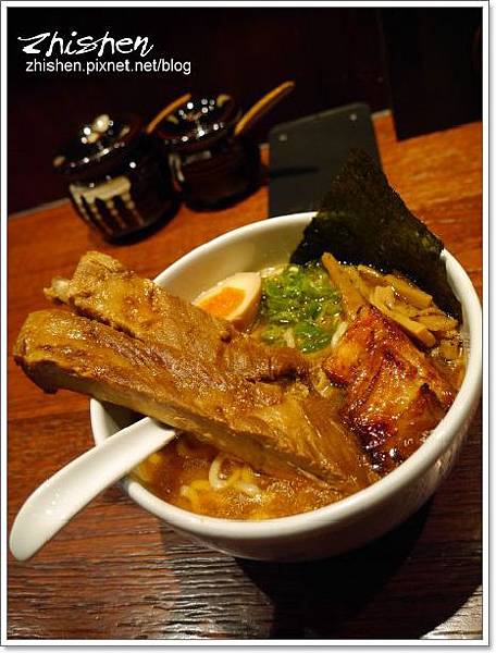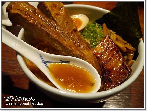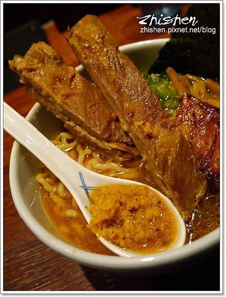 Ω招牌W Soup(豚骨系+魚介系)湯頭當然是重點中的重點,其清澄透亮,不只有醬鹹,也有深層的醬油香氣,感覺比印象中的神山湯頭有比較直覺的醬油風味,雖然魯點的原始濃厚版本湯頭一樣有比較鹹一些的感覺,但實難掩其鮮美動人!和雙刀肋排一鹹一甜之間,亦隱約有種味覺調和的美妙