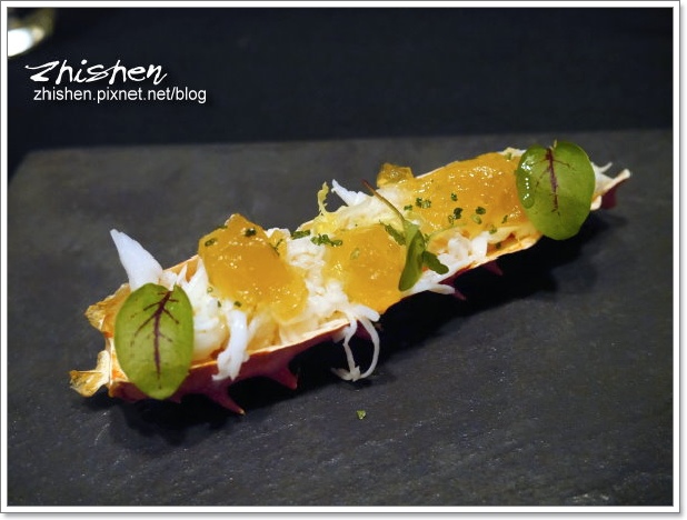 Ω帝王蟹肉嚐得出淡淡的柴魚湯香氣,搭配上頭的柚子果凍品嚐,清爽帶鮮