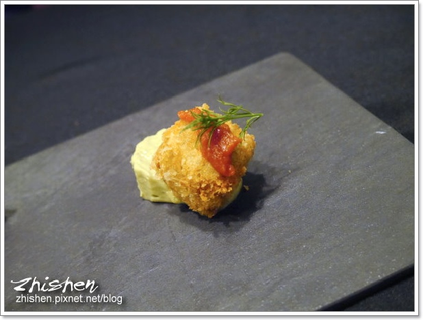 Ω酥炸蟹肉餅則是搭配酪梨醬,因為酪梨醬本身有淡淡的蕃茄香氣(單吃就有,還是魯舌頓= =?),讓蟹肉餅的風味在和醬及蕃茄末的融合上更加無縫,亦不會太過單調