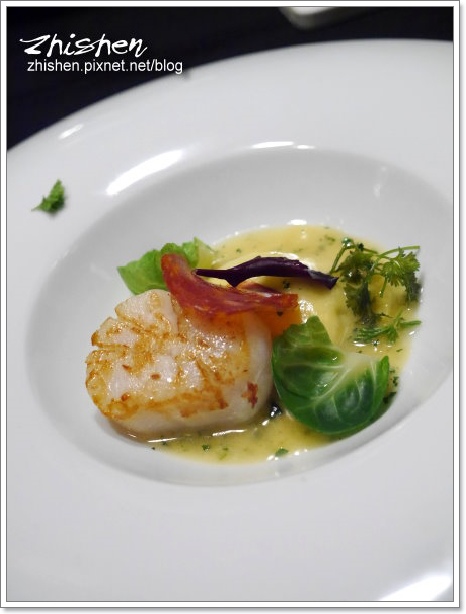 鴨肝輕薄的乳脂原本就誘人,再加上酒凍的酸甜及巧克力脆酥的脆口及甜度,輕爽多元的酸甜和油脂感完美交融,口感及風味層層交疊,第一道前菜就讓好久沒吃大餐的鄉巴佬我好生喜歡