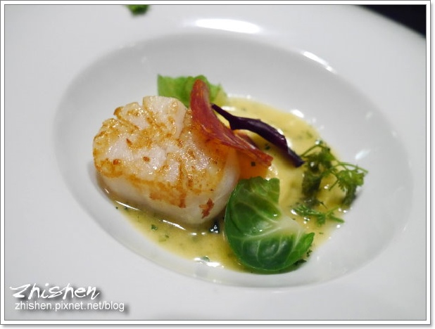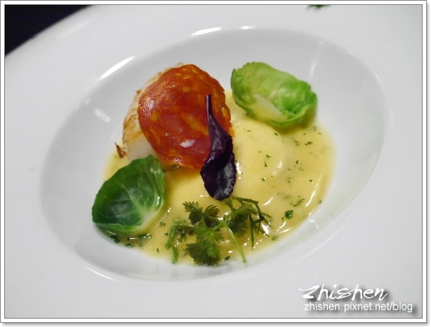 方型的義式餃子ravioli有著軟Q口感的麵皮,內餡包裹有著香濃乳香的布拉塔Burrata起司,外頭則再以輕薄奶味及淡淡香氣的鼠尾草奶油醬汁豐富整個味道,外輕內重的風味相互調合,有種說不出的合諧!而一旁外焦酥內半熟的海道炙燒干貝口感細嫩,其驚人的鮮味甜度著實令人為之眼睛一亮