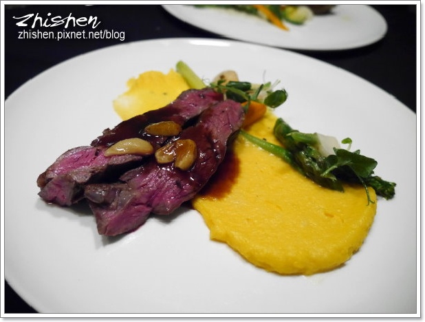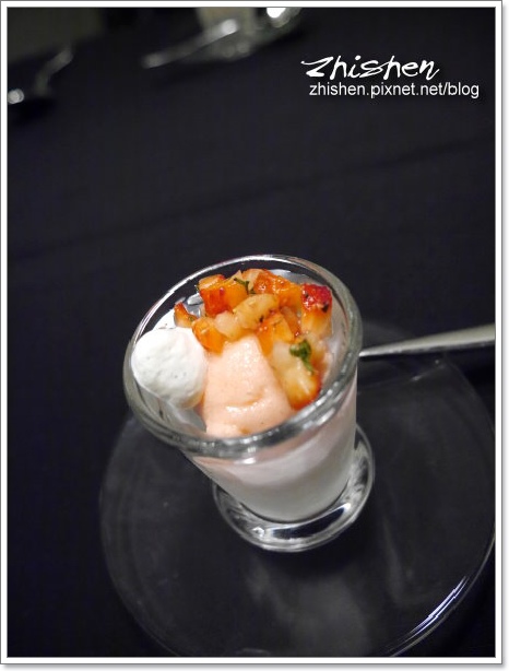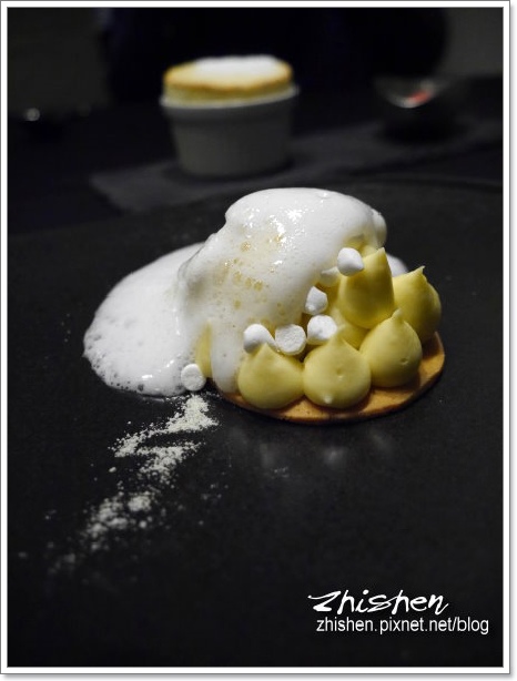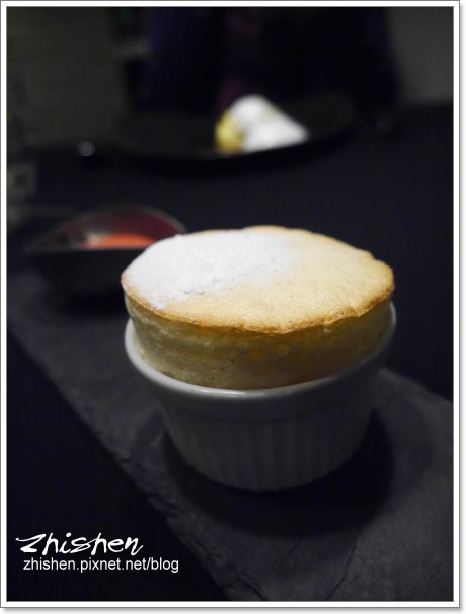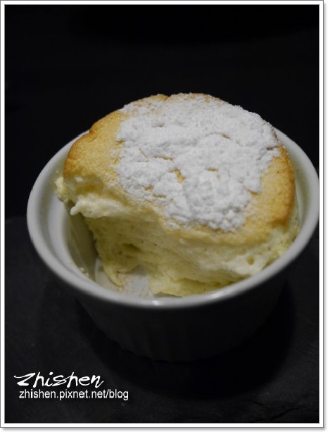 第一次嚐到高水平的舒芙蕾,輕薄的香氣、鬆軟的口感令魯相當驚豔,這道應該是要搭配覆盆子冰沙一起享用,不過魯和牛爺入口後實在是停不下手中的湯匙,還沒冰火五重天之前已喀掉大半Orz