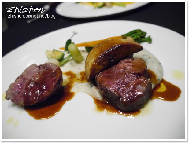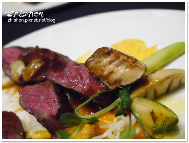 小牛菲力肉味鮮美,因為其肉感偏瘦,油脂感稍薄,嫩中帶點口感,店家是以炙燒至外酥內嫩的鴨肝搭配享用,以其豐厚油脂加以潤飾,經典搭配、細膩口味