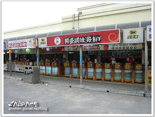 梧棲漁貨直銷中心外頭的海鮮雜貨步道上,原本魯就打定主意要買燒酒螺吃的店家「阿姿調味海鮮」(以下簡稱阿姿)便在其中。