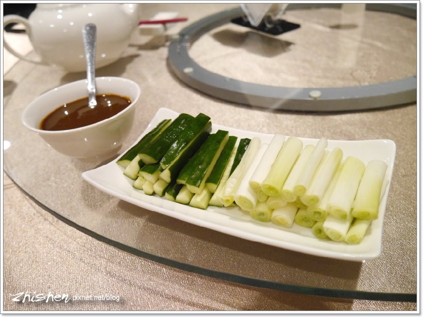 Ω也別忘了一開始就在桌上的主要配角,甜麵醬及黃瓜、蔥段,包著鴨皮、荷葉餅吃,不僅解油膩,口感更棒。
