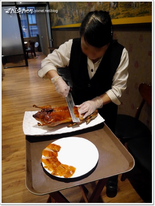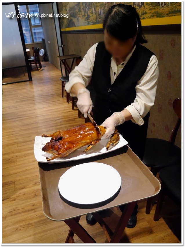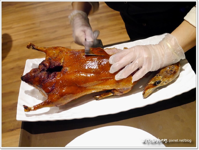 服務大姊一聲招呼,我們的烤鴨來了,魯特別請大姊刀下留鴨讓我拍個照@@
