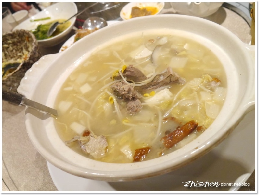 二吃的酸白菜鴨架湯,聽說酸白菜也是店家自製,一喝下去就知道合味,是魯喜歡溫和順口風,輕薄酸香不脫自然,雖說越見鍋底風味越重,喝了五碗還沒膩,是不錯的好湯。