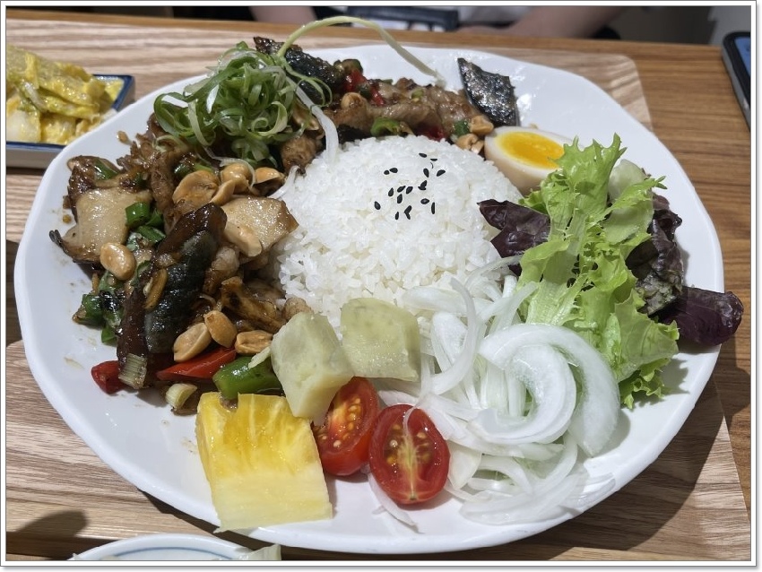 松阪套餐除了黃金泡菜…等套餐配菜外,盤子上還有不少有點兒像是早午餐那種的生菜蔬果佐拌,豐盛感更勝梅干牛肉~