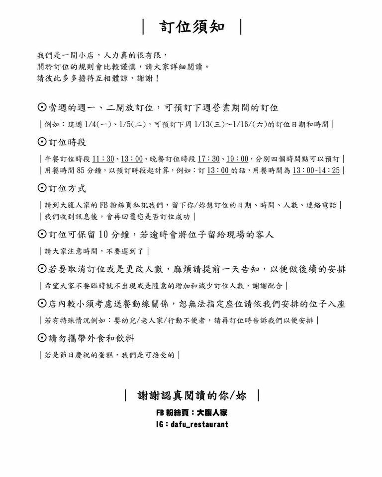 一開始想訂位時找不到電話,後來到FB官網才看到這個訂位須知~