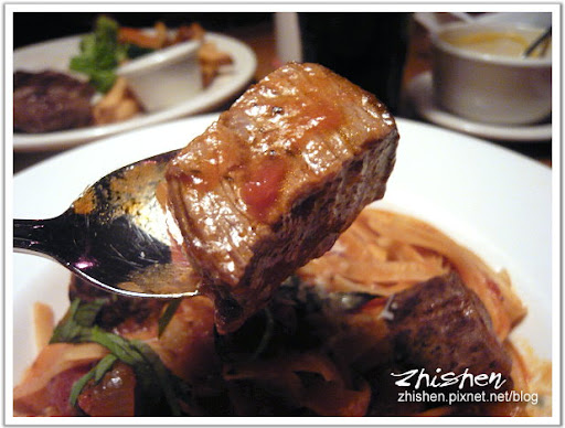 從小到大還沒吃過牛排麵說XD蕃茄底的醬料味道溫和,麵條入味,Q度也算適中(不Q硬),最主要是麵的量算滿大的,我想單人單食應該會相當飽足